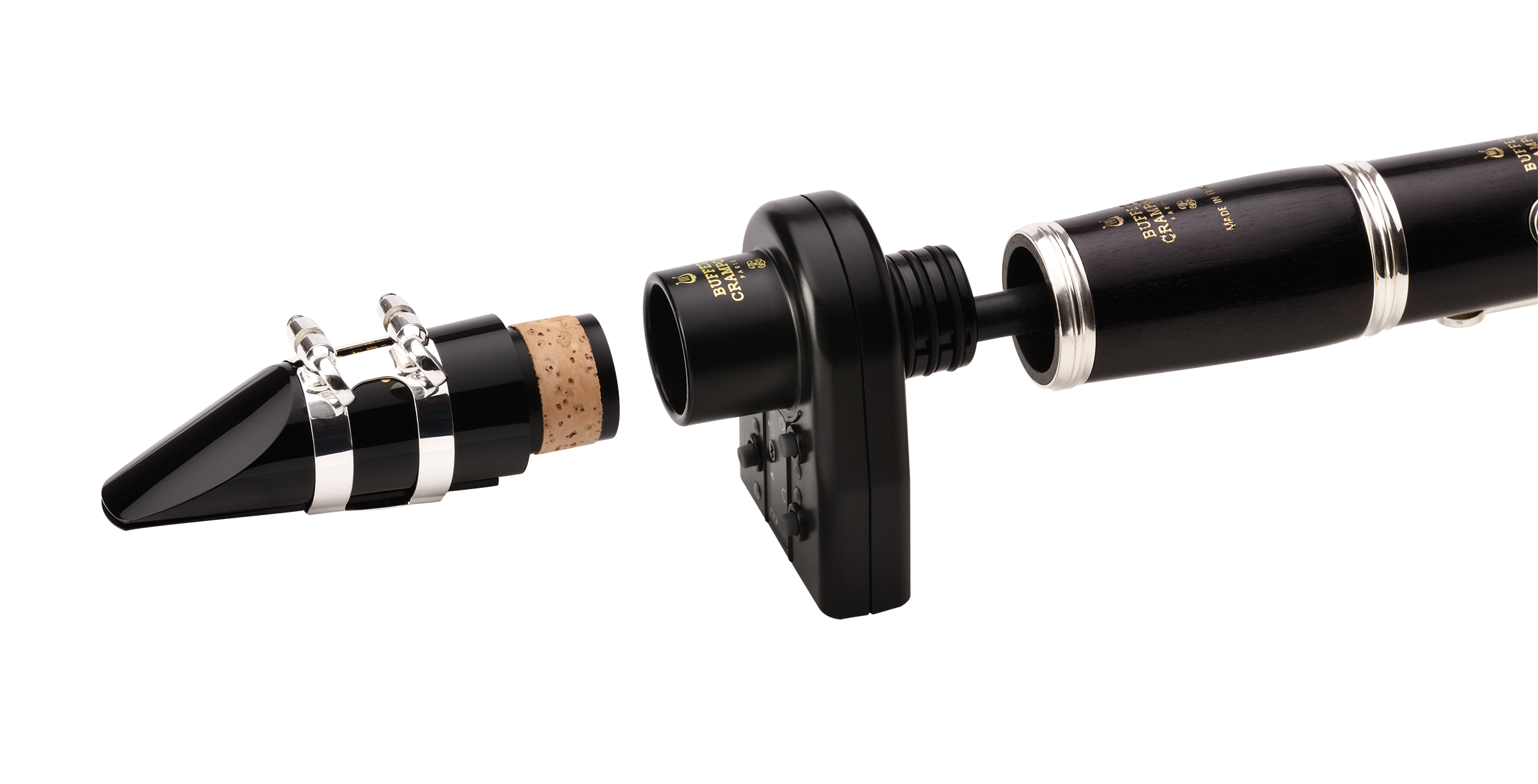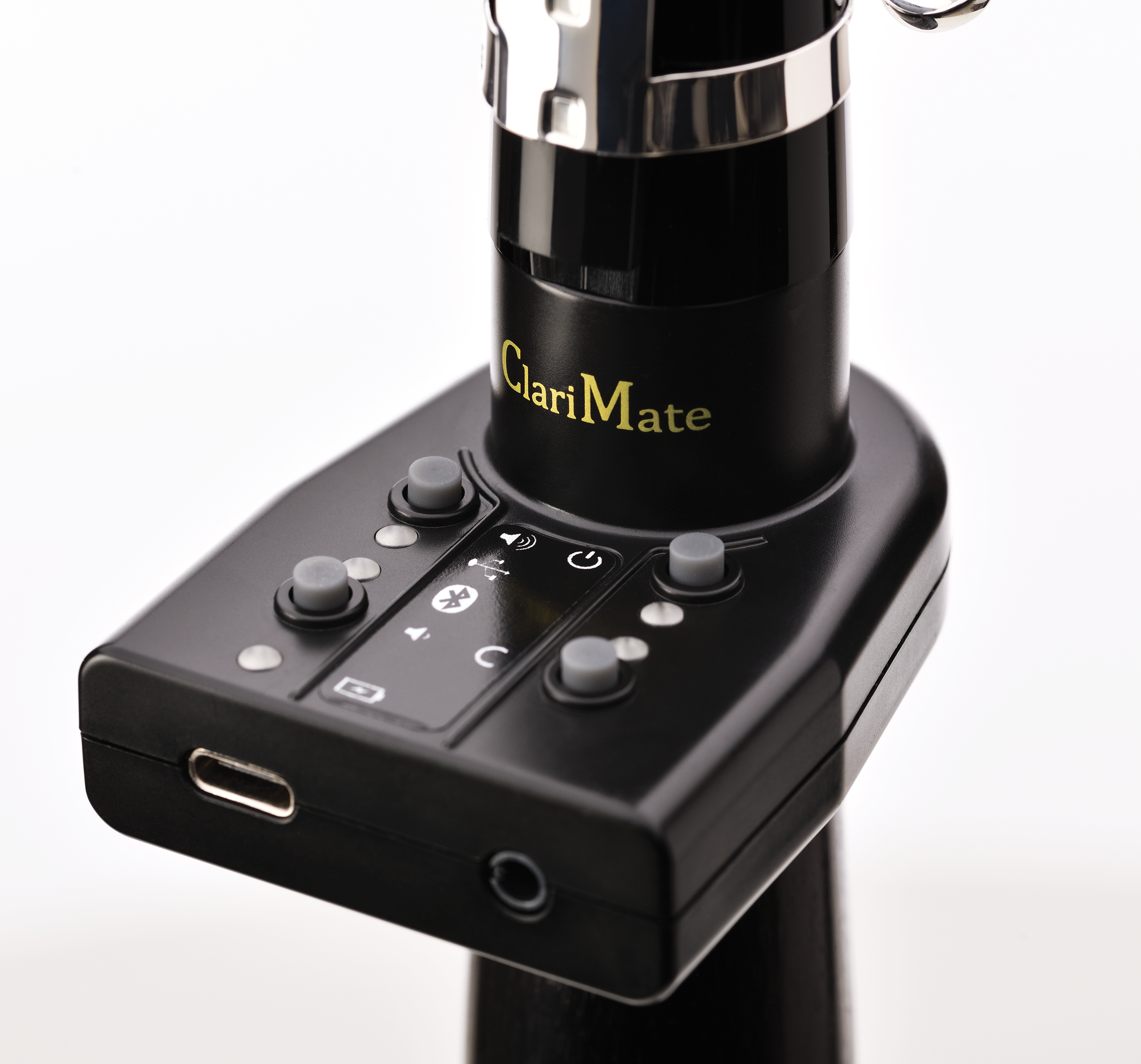 ClariMate is a digital mute and reversible hybrid instrument that can be attached to any Bb clarinet. Use the ClariMate to practice silently, or use it as a MIDI controller with the ClariMate application to explore the world of digital music. It uses high precision sensors and patented note recognition technology to translate reed, breath, and fingerings into digital signals. Connect your wired headphones to the ClariMate to play silently with a virtual, sample-based clarinet synthesizer, or connect it to a computer, tablet, or phone to use it as a MIDI controller and unlock the possibilities of digital music creation.